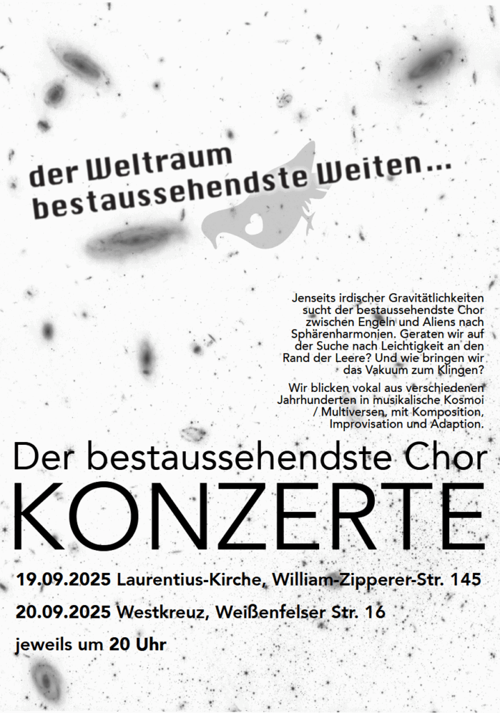Jenseits irdischer Gravitätlichkeiten sucht der bestaussehendste Chor zwischen Engeln und Aliens nach Sphärenharmonien. Geraten wir auf der Suche nach Leichtigkeit an den Rand der Leere? Und wie bringen wir das Vakuum zum Klingen? Wir blicken vokal aus verschiedenen Jahrhunderten in musikalische Kosmoi / Multiversen, mit Komposition, Improvisation und Adaption.